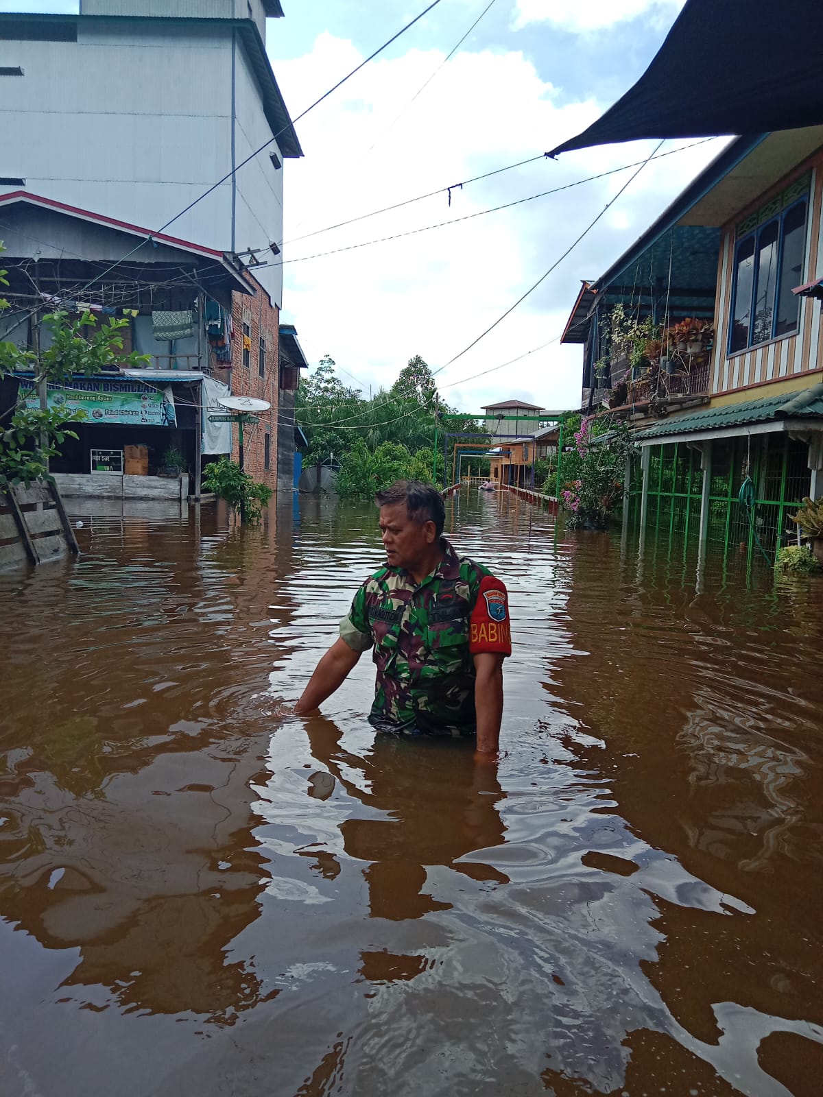 “Akhir-akhir ini intensitas hujan semakin tinggi, sehingga warga harus ekstra hati-hati dan waspada bila terjadi bencana banjir yang lebih besar sehingga bisa meminimalisir jatuhnya korban jiwa, saat ini ketinggian air di dalam rumah warga di mencapai ketinggian -+ 1m menggenangi rumah warga sebanyak -+150 Unit, ucap Babinsa