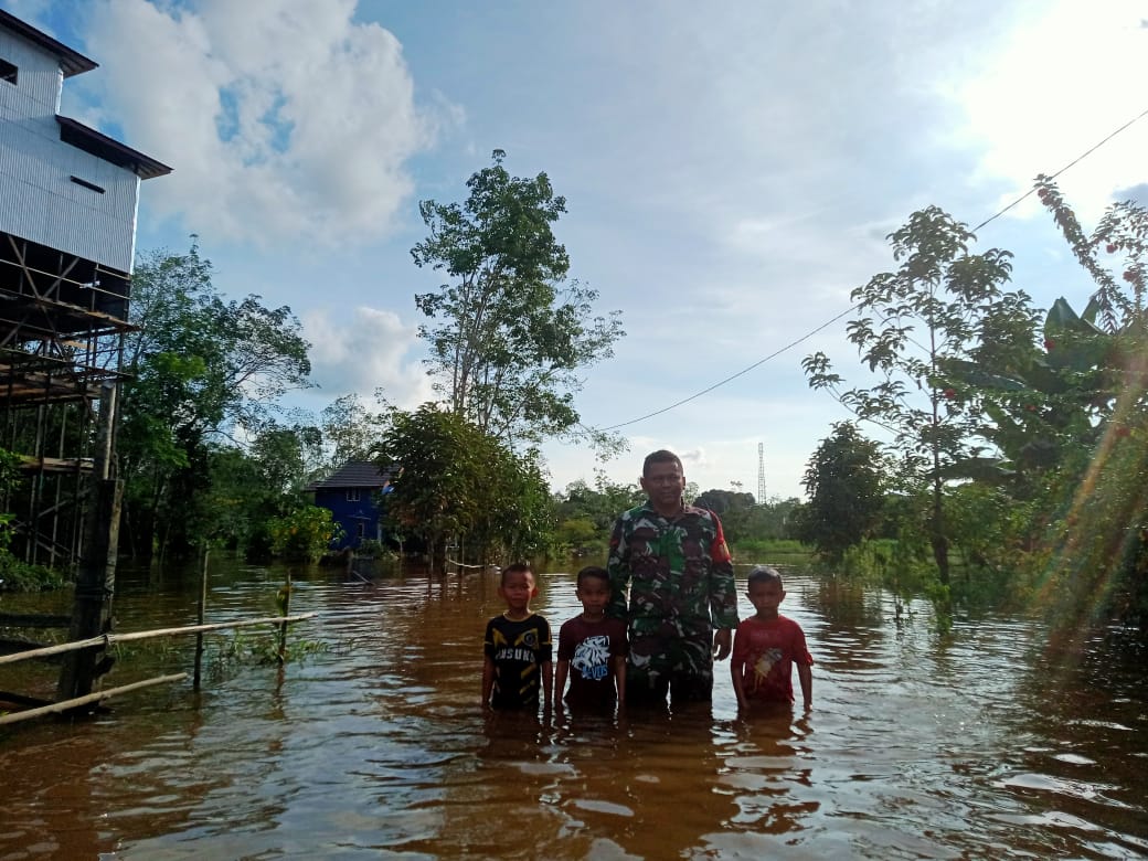 Babinsa Koramil 1013-08/Laung Tuhup langsung aktif membantu warga sekitar serta membantu anak sekolahan menyeberangi badan jalan yang tergenang akibat luapan air sungai.
