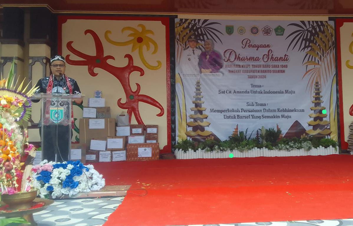 Tribunborneo. com- Buntok – Barito Selatan – Dalam rangka perayaan Dharma Santi Hari Raya Nyepi Tahun Baru Saka 1946, Kabupaten Barito Selatan menggelar acara yang dihadiri oleh berbagai tokoh dan pemuka agama Hindu. Kadis Perkimtan Barito Selatan, Bennie S Mahar, ST, MM, MT, mewakili Pj. Bupati Barito Selatan H. Deddy Winarwan pada acara yang berlangsung di taman Iring Witu Buntok. 2/5/2024 pagi Tribunborneo.com