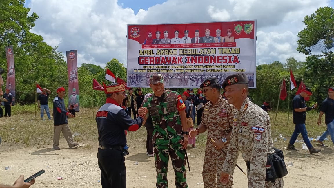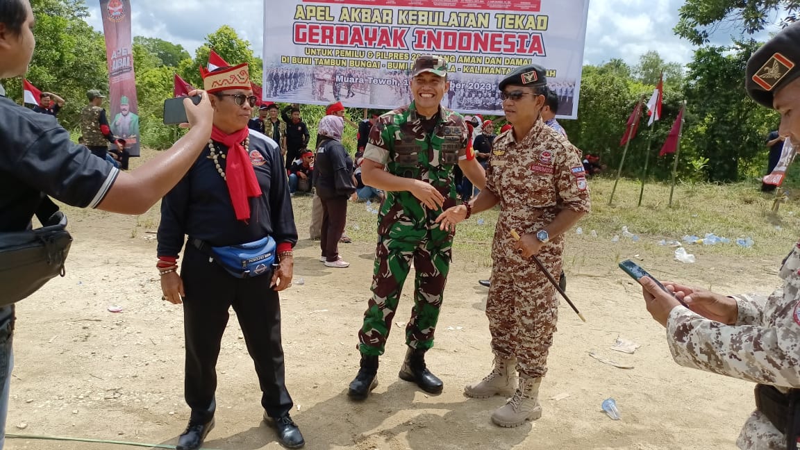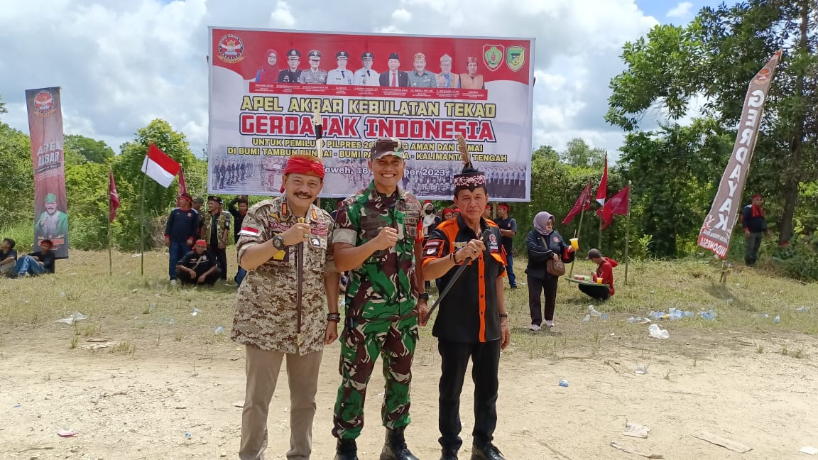 Sehingga, pada kesempatan yang baik ini, saya mengapresiasi setinggi-tingginya kepada Gerdayak Indonesia yang sudah menginisiasi, untuk melaksanakan apel akbar dalam rangka kebulatan tekad, untuk pemilu aman dan damai di bumi tambun bungai bumi pancasila Kalteng dan mengajak seluruh masyarakat serta elemen- elemen lainnya untuk bersatu padu menjaga agar Kalteng ini khususnya Barut selalu kondusif walaupun berbeda pendapat,” Tutur Dandim 1013/Mtw