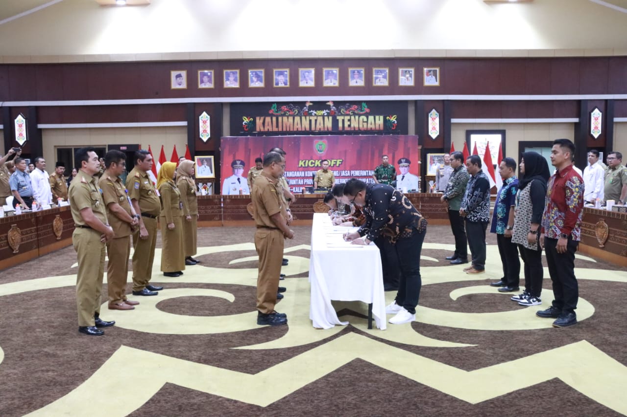 Tribunkalimantan.com||Palangka Raya – Pemerintah Provinsi Kalimantan Tengah (Pemprov Kalteng) menggelar Kick Off Penandatanganan Kontrak Pengadaan Barang dan Jasa Pemerintah secara kolektif di Lingkup Pemerintah Provinsi dan Pemerintah Kabupaten/Kota Se-Kalteng Tahun 2024. Acara ini, yang berlangsung di Aula Jayang Tingang (AJT) LT. II Kantor Gubernur Kalteng pada Senin (29/1/2024), dipimpin langsung oleh Gubernur Kalteng H. Sugianto Sabran.
