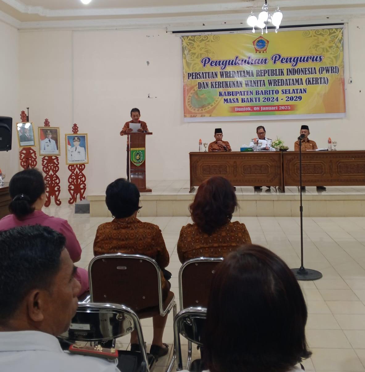 Tribunkalimantan.  com -Buntok, Barito Selatan (  Barsel) Kalimantan Tengah ( Kateng)   Pengurus Persatuan Wredatama Republik Indonesia (PWRI) dan Kerukunan Wanita Wredatama (Kerta) Kabupaten Barito Selatan periode 2024-2029 resmi dikukuhkan. Acara pengukuhan yang berlangsung di Aula Kantor Bappeda Kabupaten Barito Selatan ini dipimpin oleh Asisten III Drs. Mirwansyah, M.A., yang mewakili Pemerintah Daerah Kabupaten Barito Selatan. Kegiatan ini dihadiri oleh unsur Forkopimda dan pengurus terpilih PWRI dan Kerta. Rabu 08/01/2025